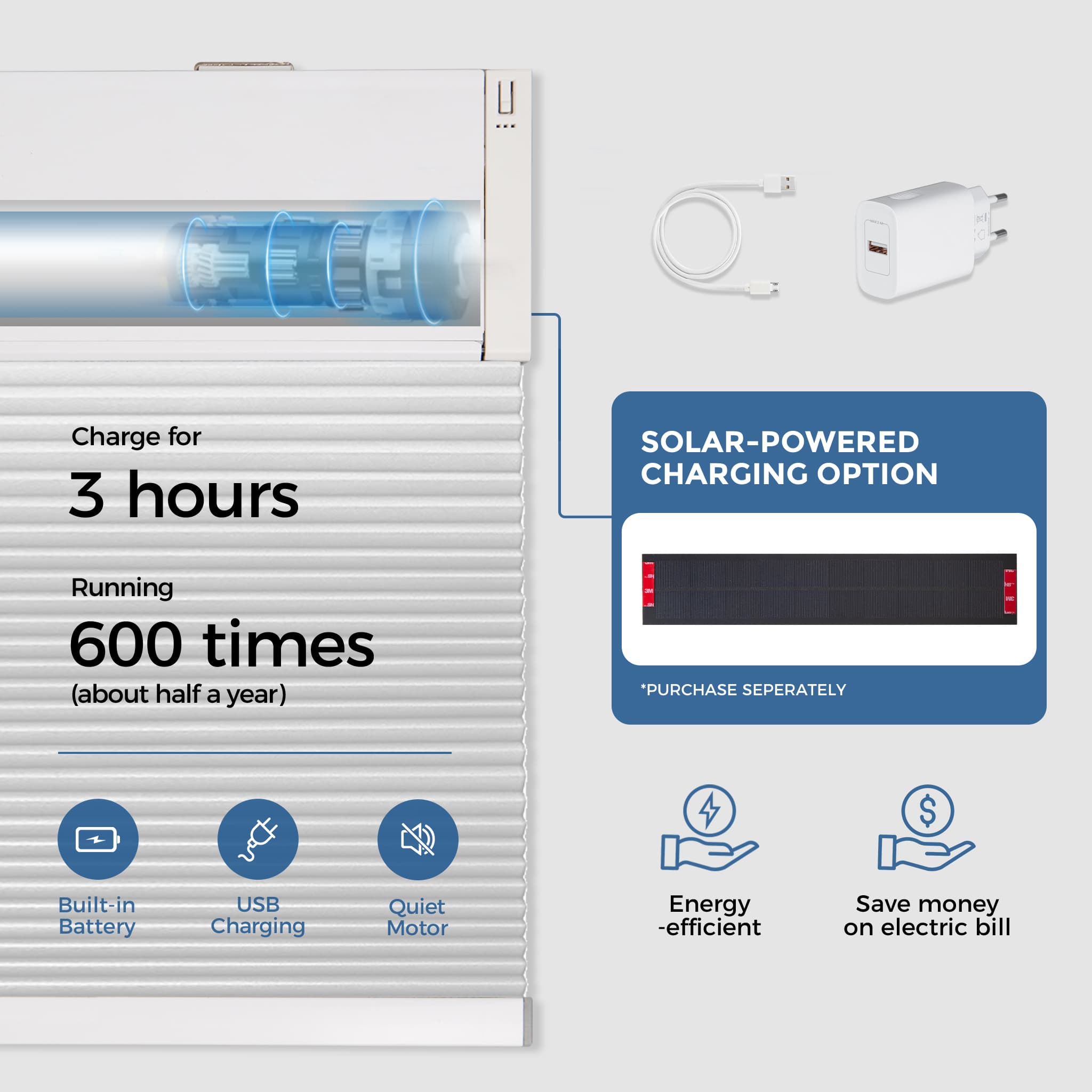 Convenient and easy to recharge using a standard 3-meter USB-C cable (included). Eco-friendly solar panel option that keeps your blinds powered using sunlight. Perfect for windows that receive ample natural light. Stylish and functional, our power window shades for home suit any interior design.