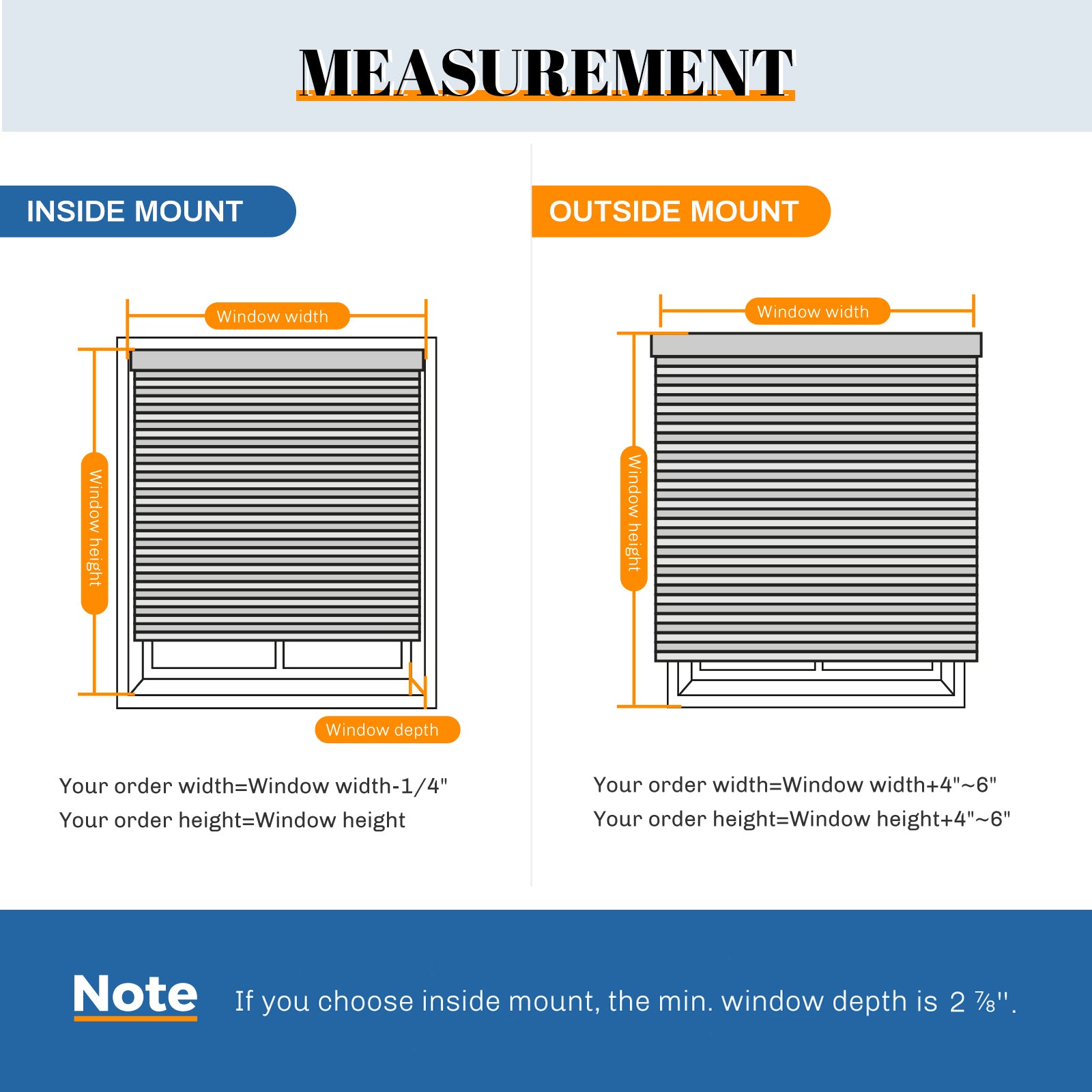 - Measuring the depth: Your window needs to be deep enough for an inside mount. For dry-battery model, the minimum depth is 1 ⅞’’. For rechargeable model, the minimum depth is 2 ⅞’’.