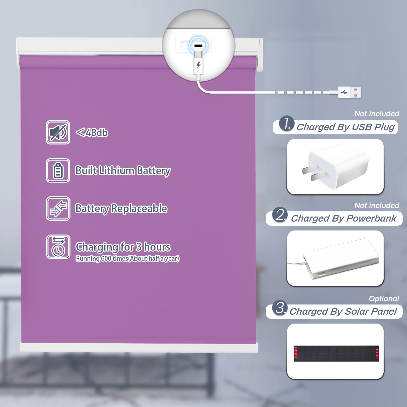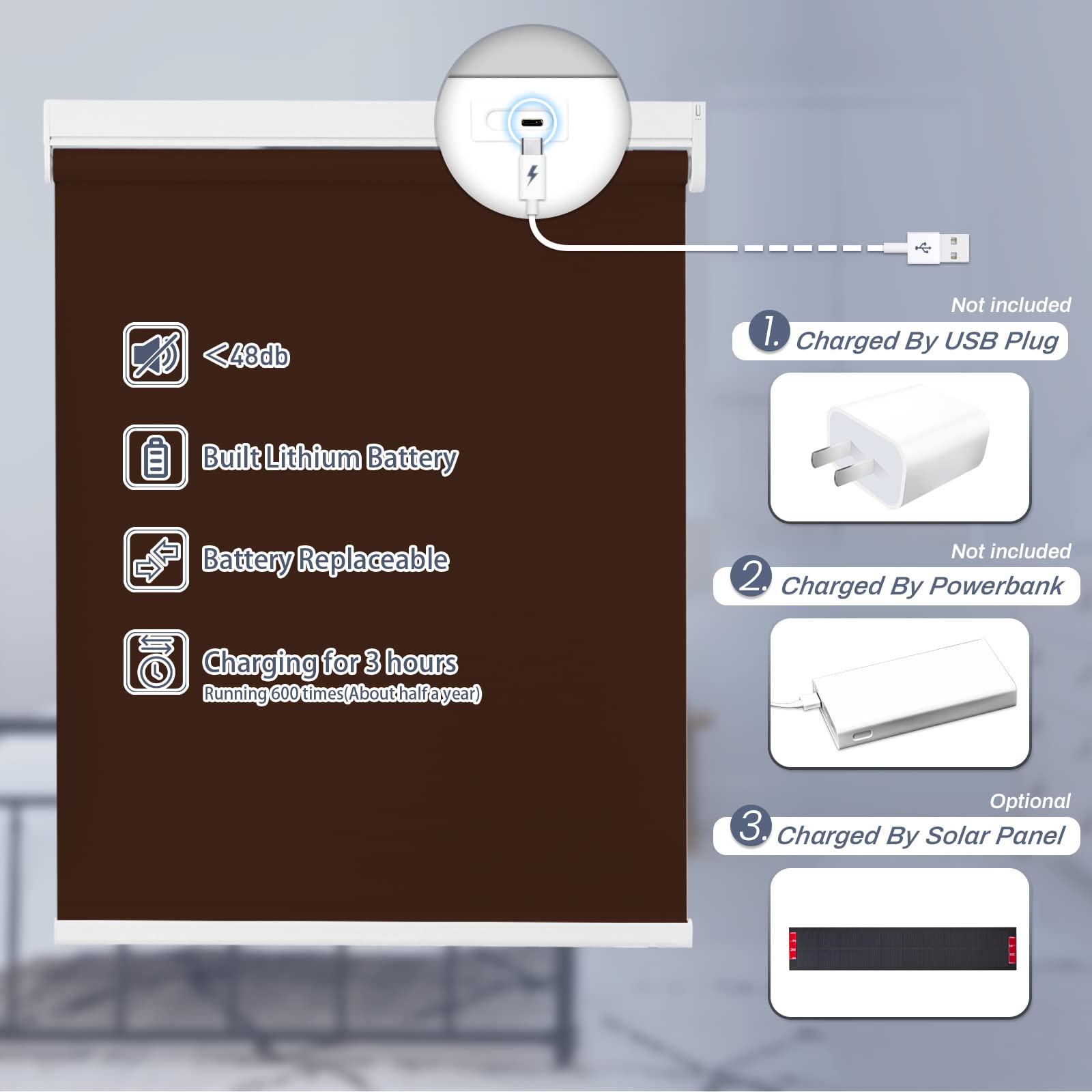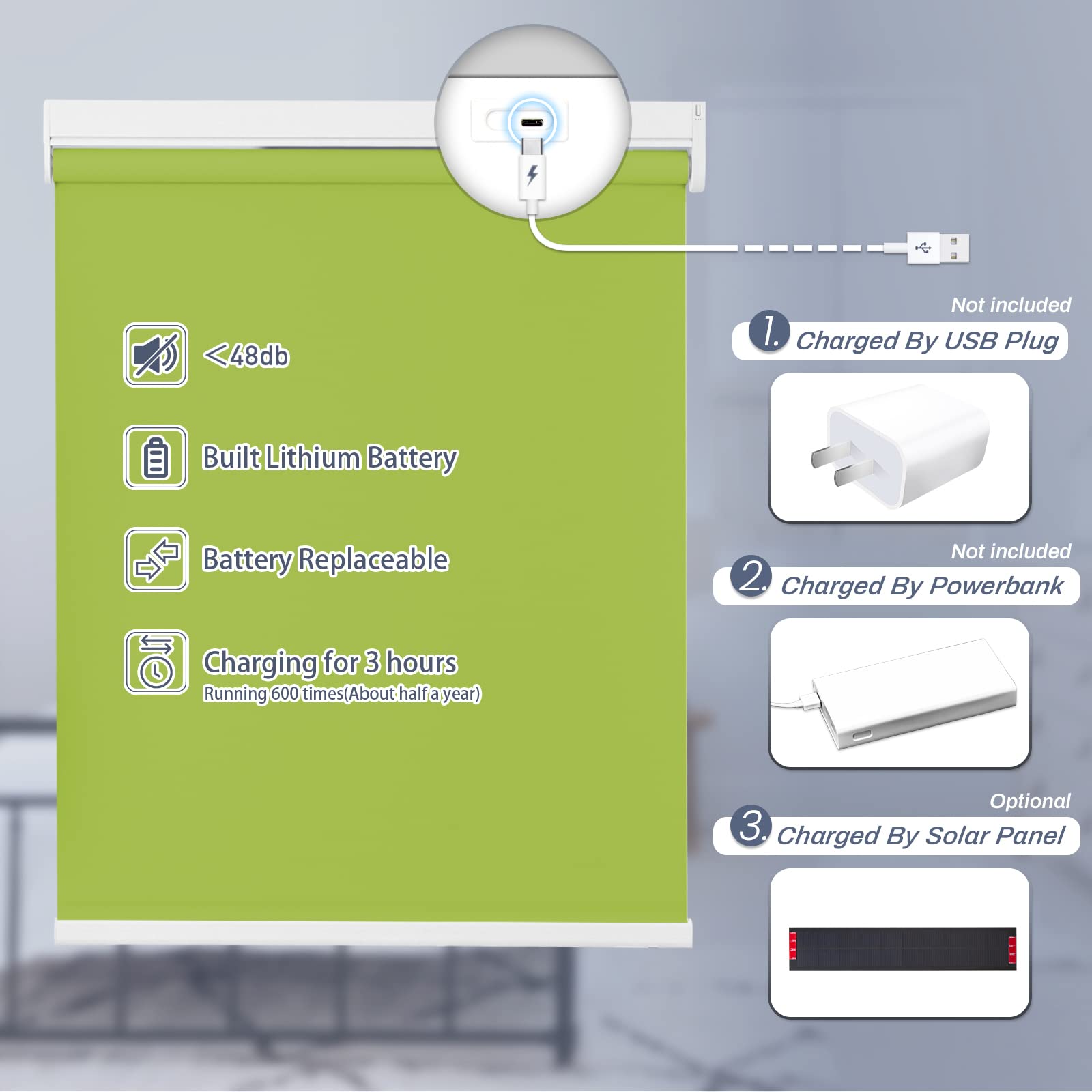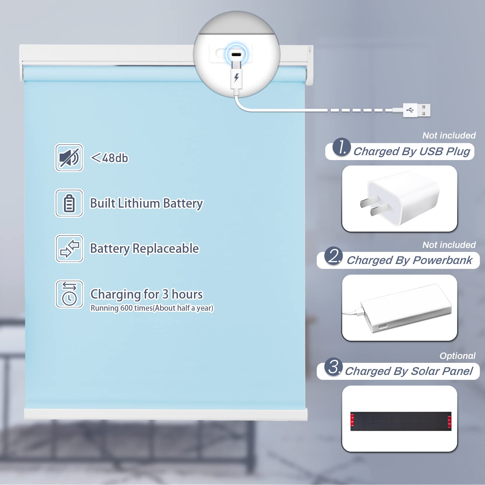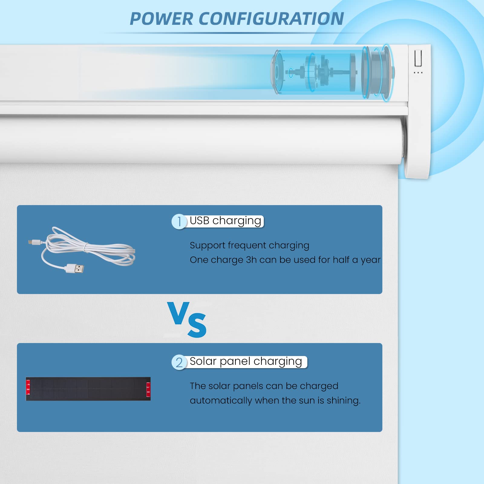 Choose from convenient USB cable charging or solar powered roller shades to save energy. USB charging option includes a 3-meter charging cable. The solar panel needs to be pasted on a sunny window to maintain continuous power generation. Long-lasting performance is guaranteed with our motorized roller shades battery options.