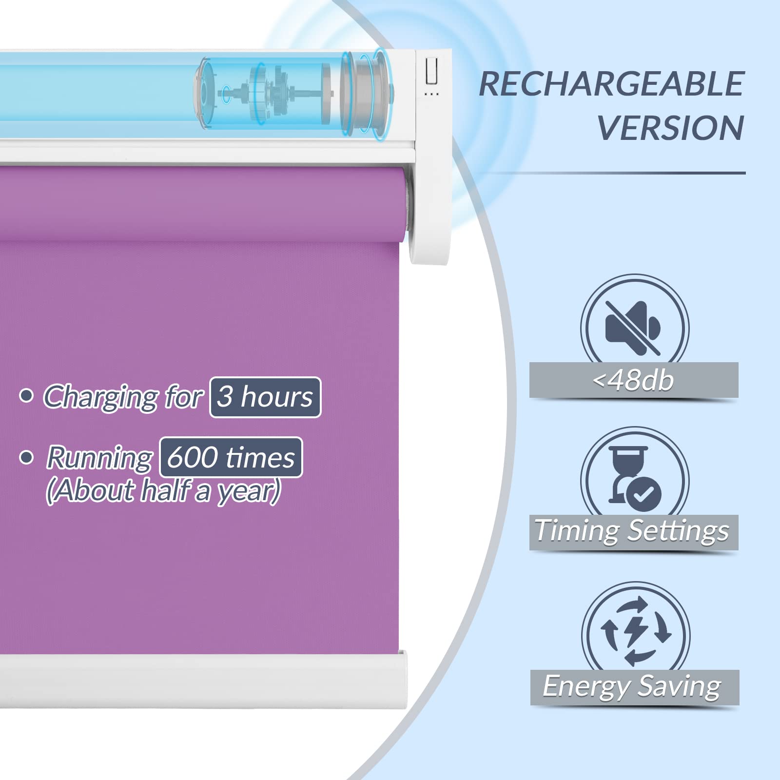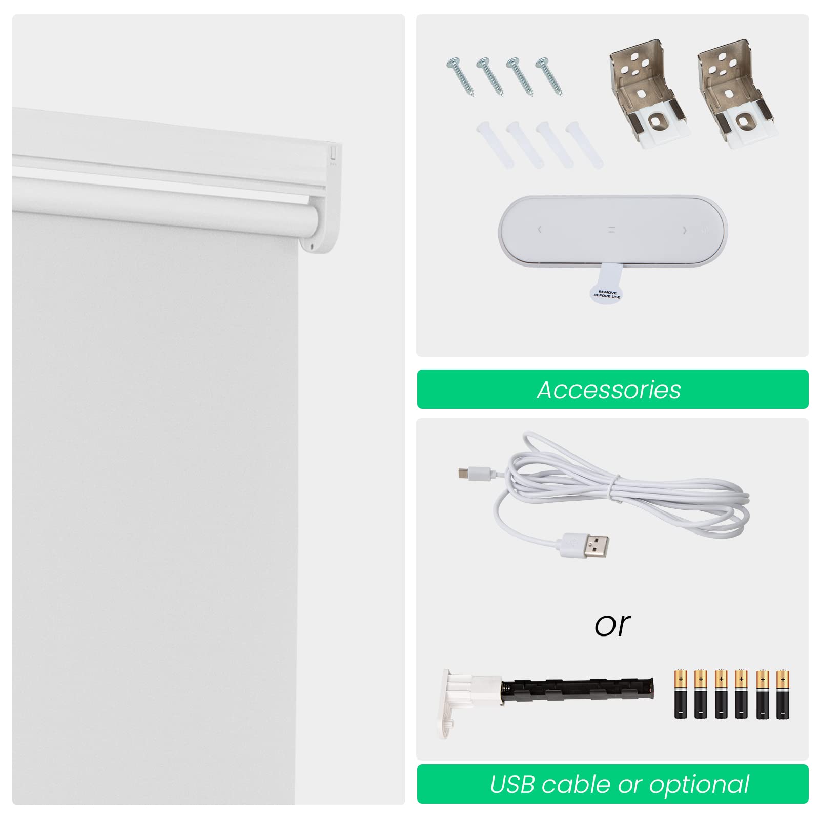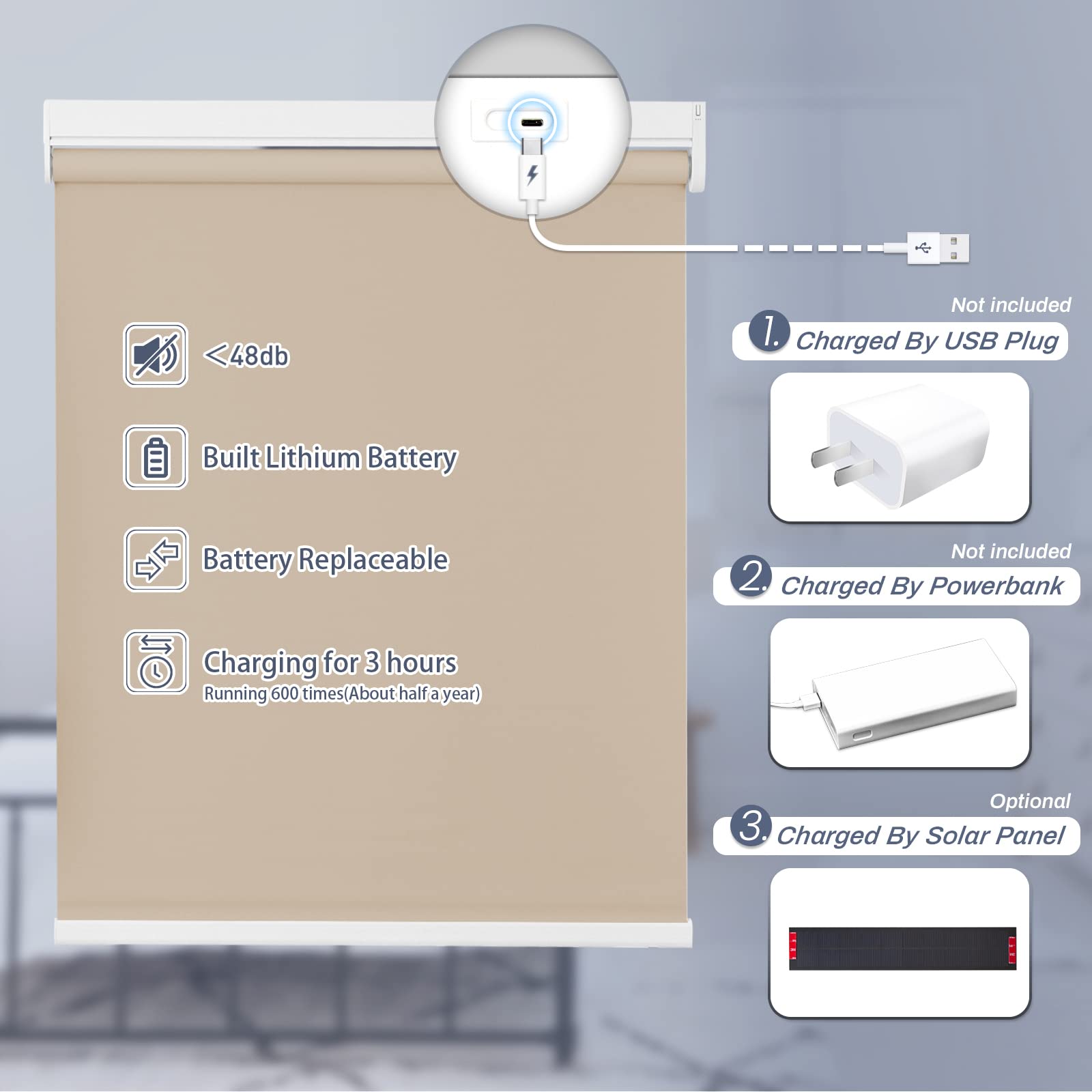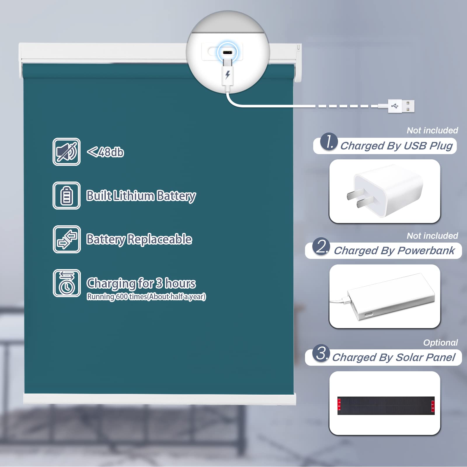 Choose from convenient USB cable charging or solar powered roller shades to save energy. USB charging option includes a 3-meter charging cable. The solar panel needs to be pasted on a sunny window to maintain continuous power generation. Long-lasting performance is guaranteed with our motorized roller shades battery options.