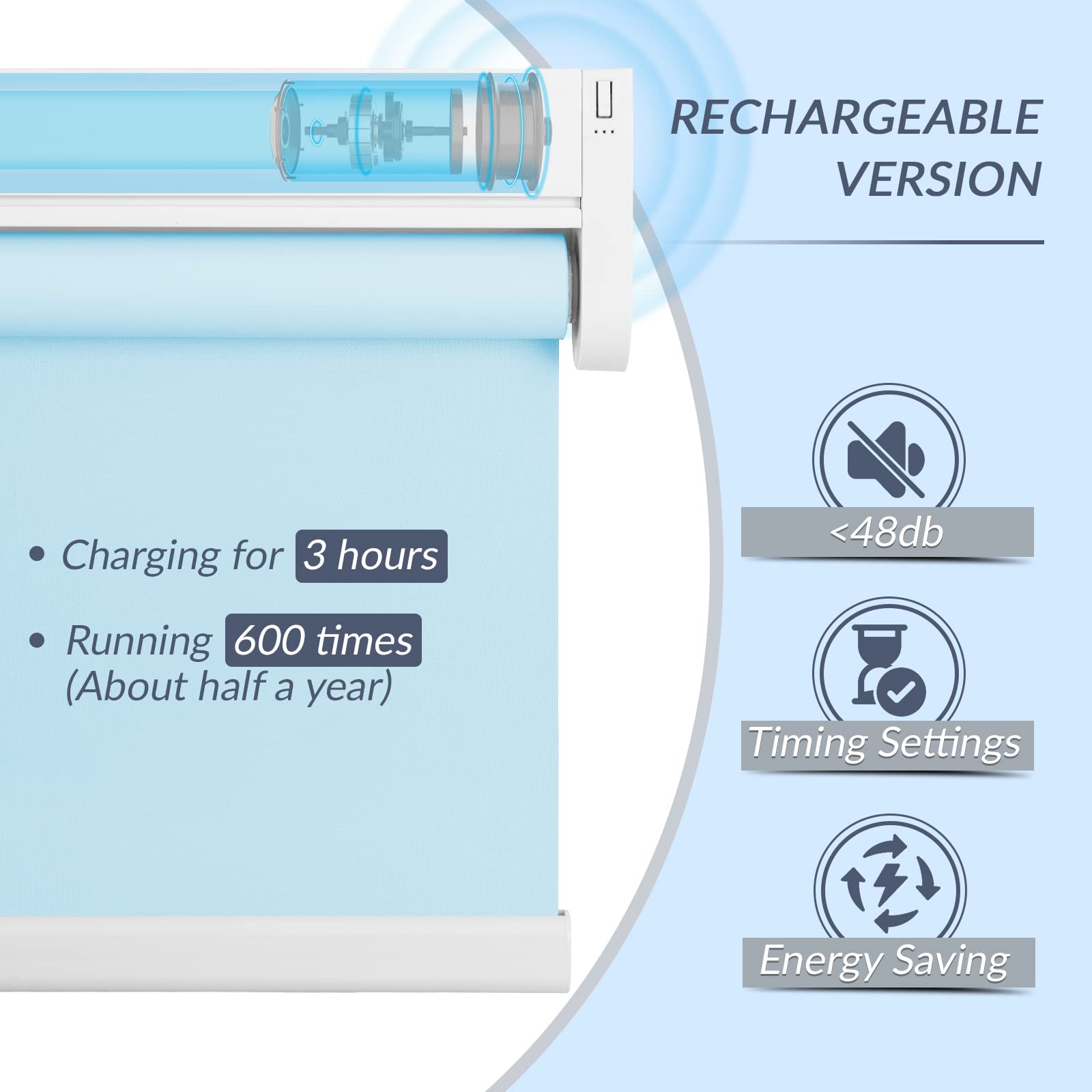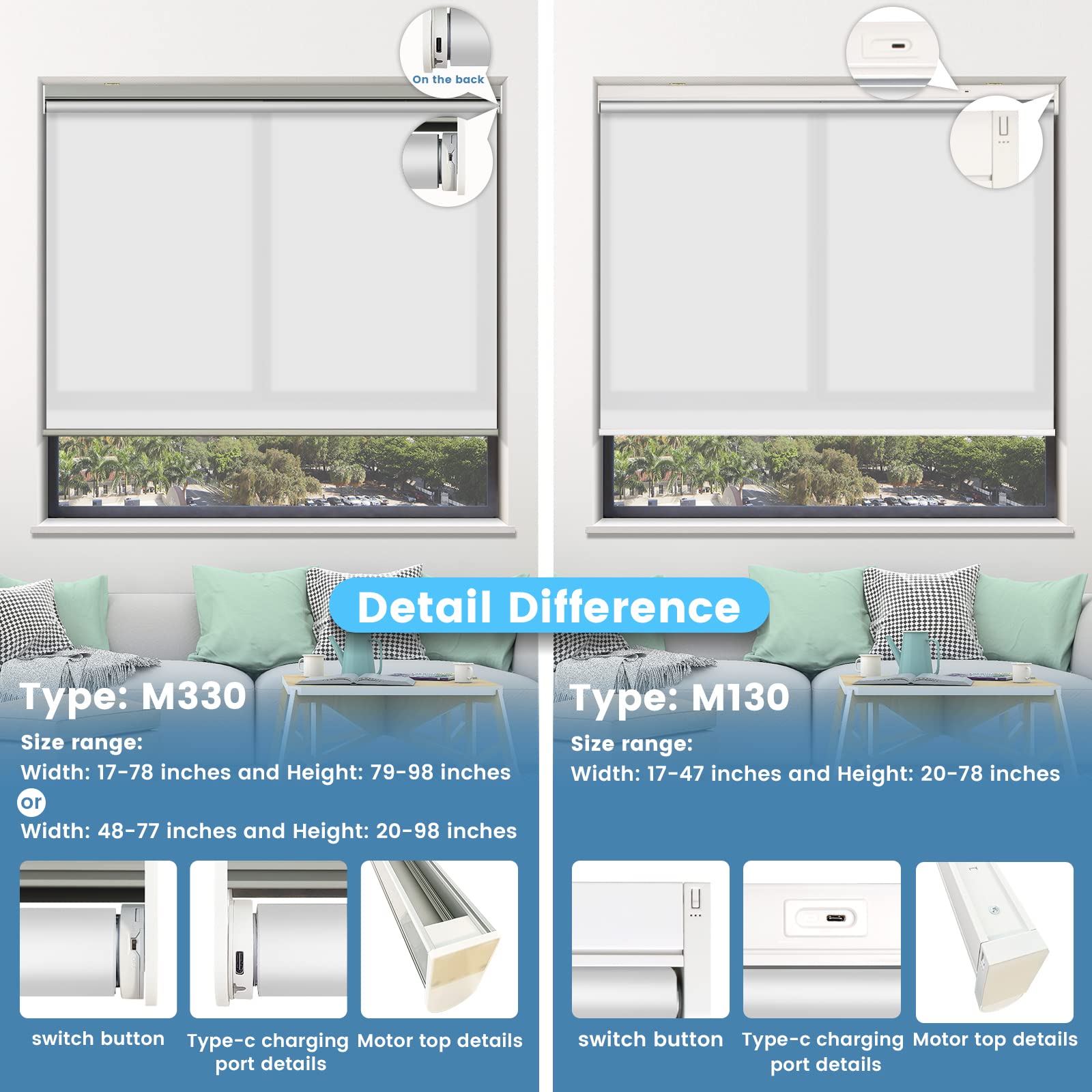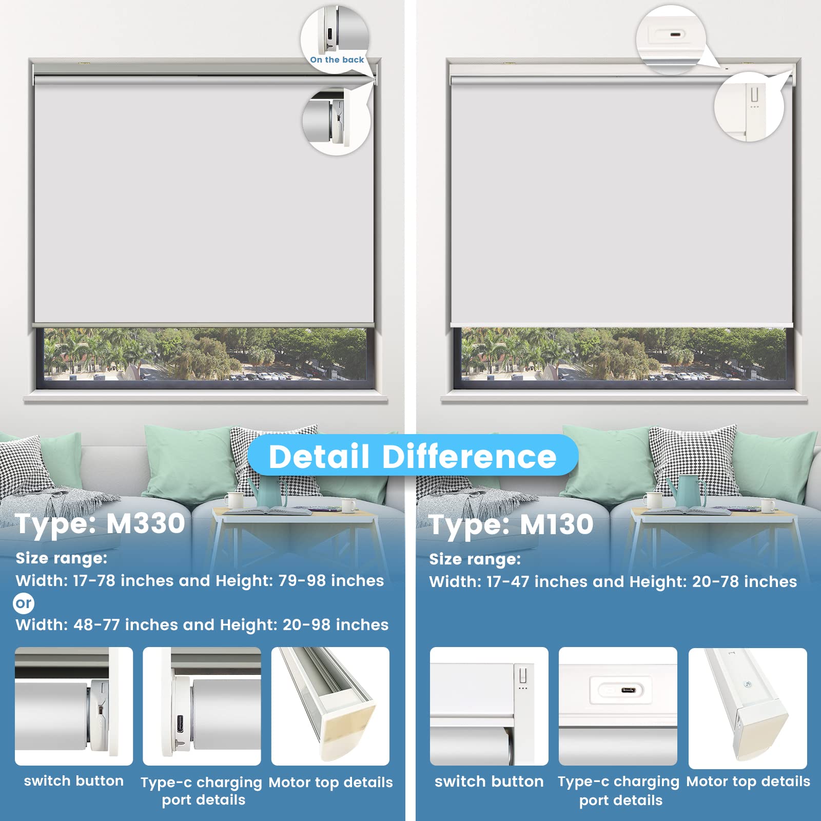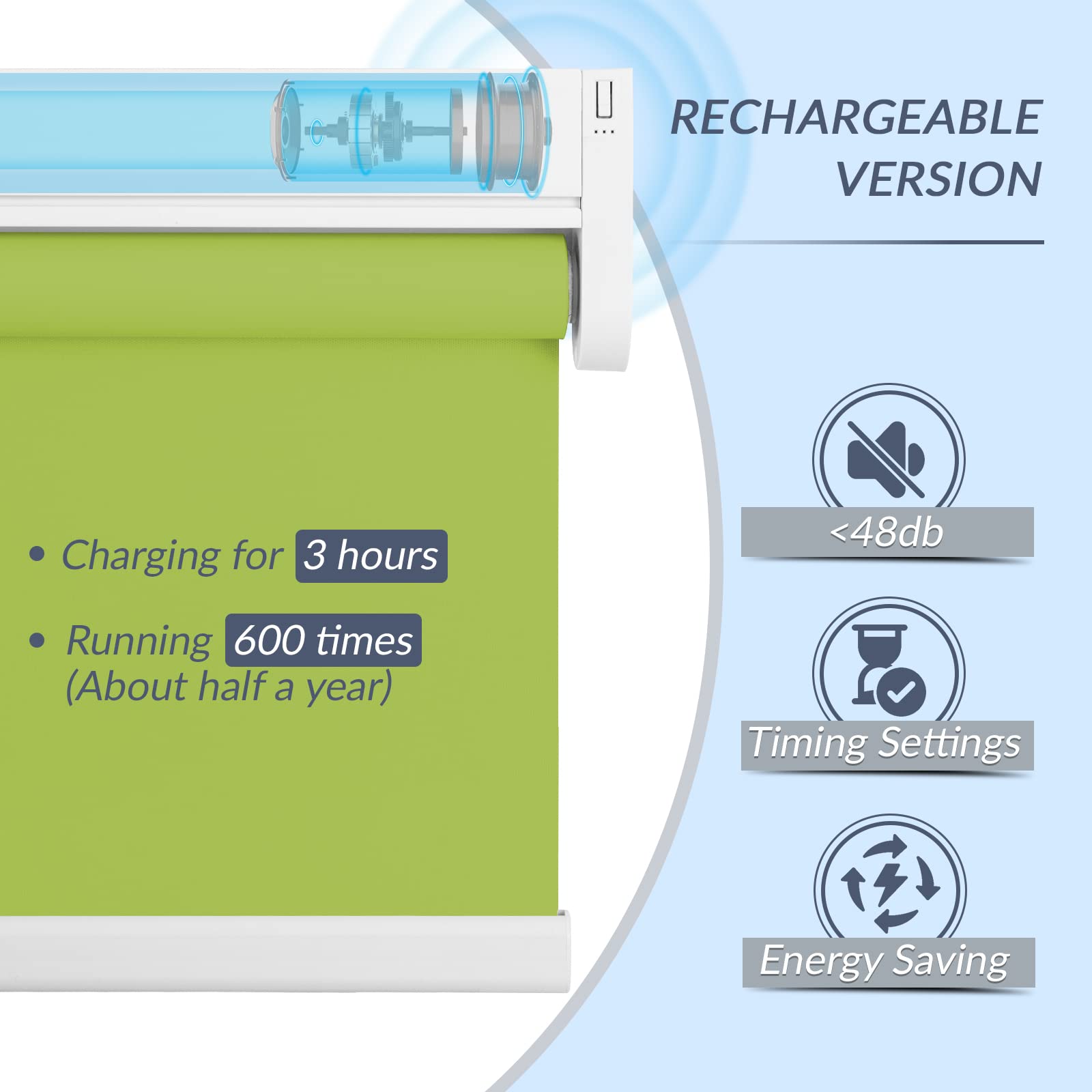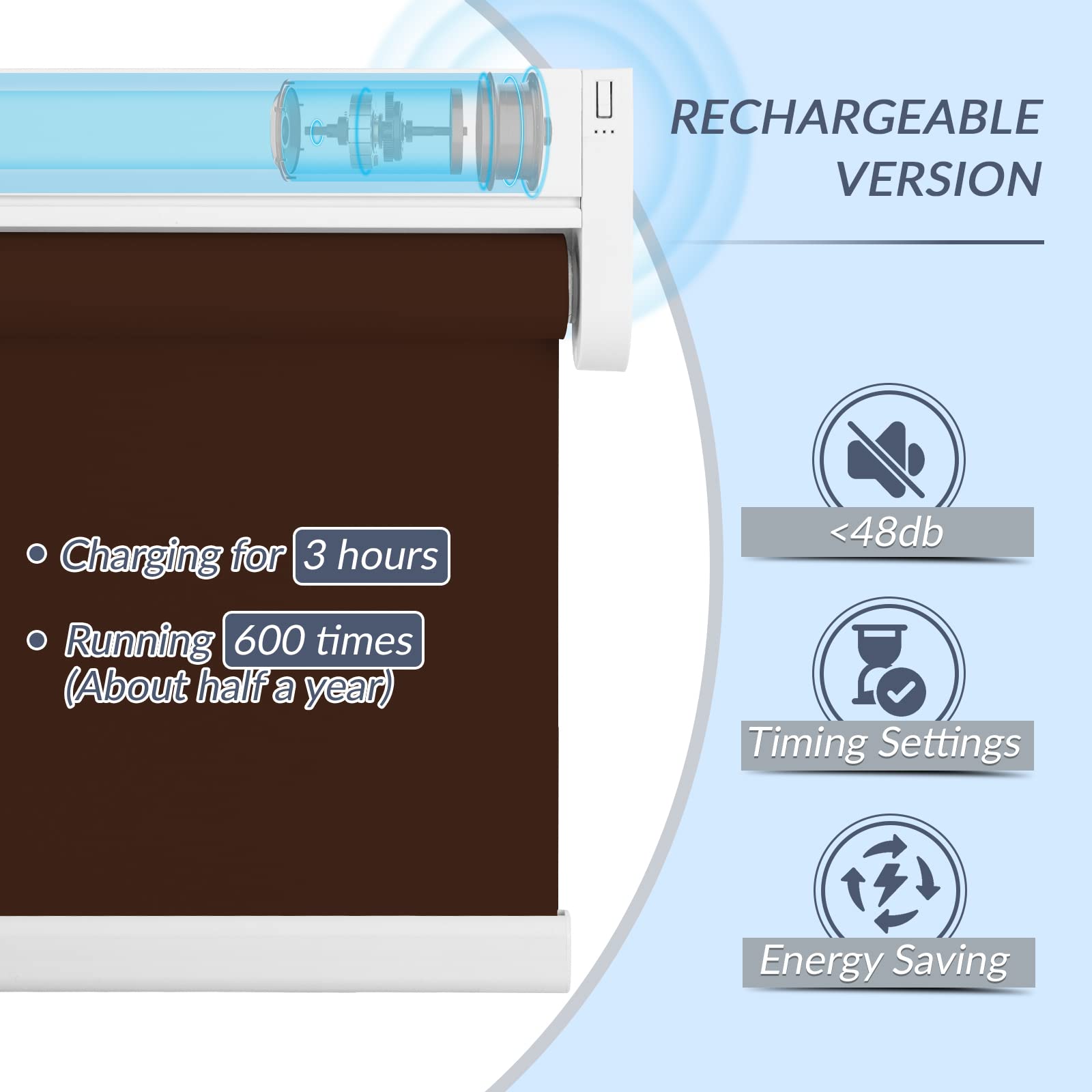 Choose from convenient USB cable charging or solar powered roller shades to save energy. USB charging option includes a 3-meter charging cable. The solar panel needs to be pasted on a sunny window to maintain continuous power generation. Long-lasting performance is guaranteed with our motorized roller shades battery options.