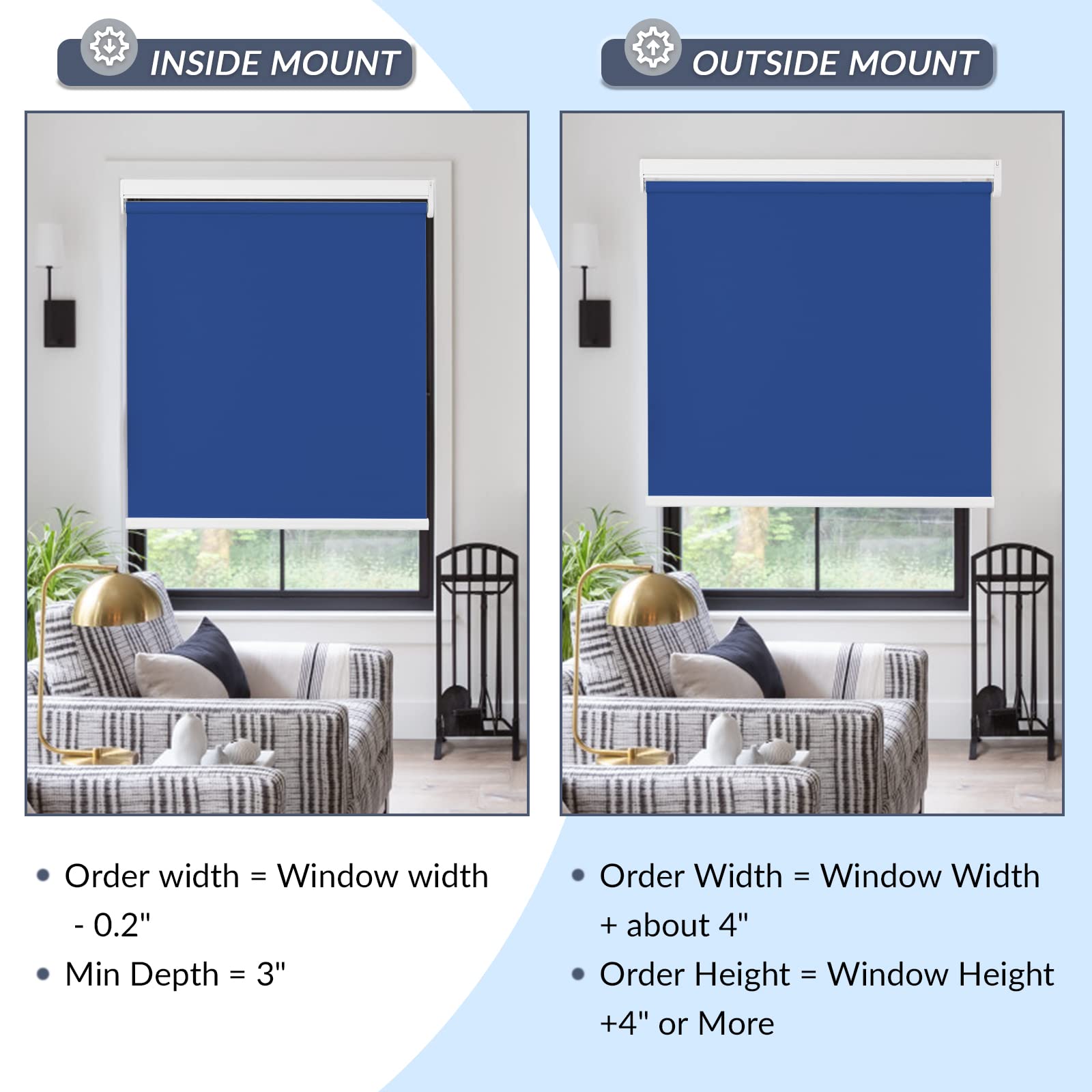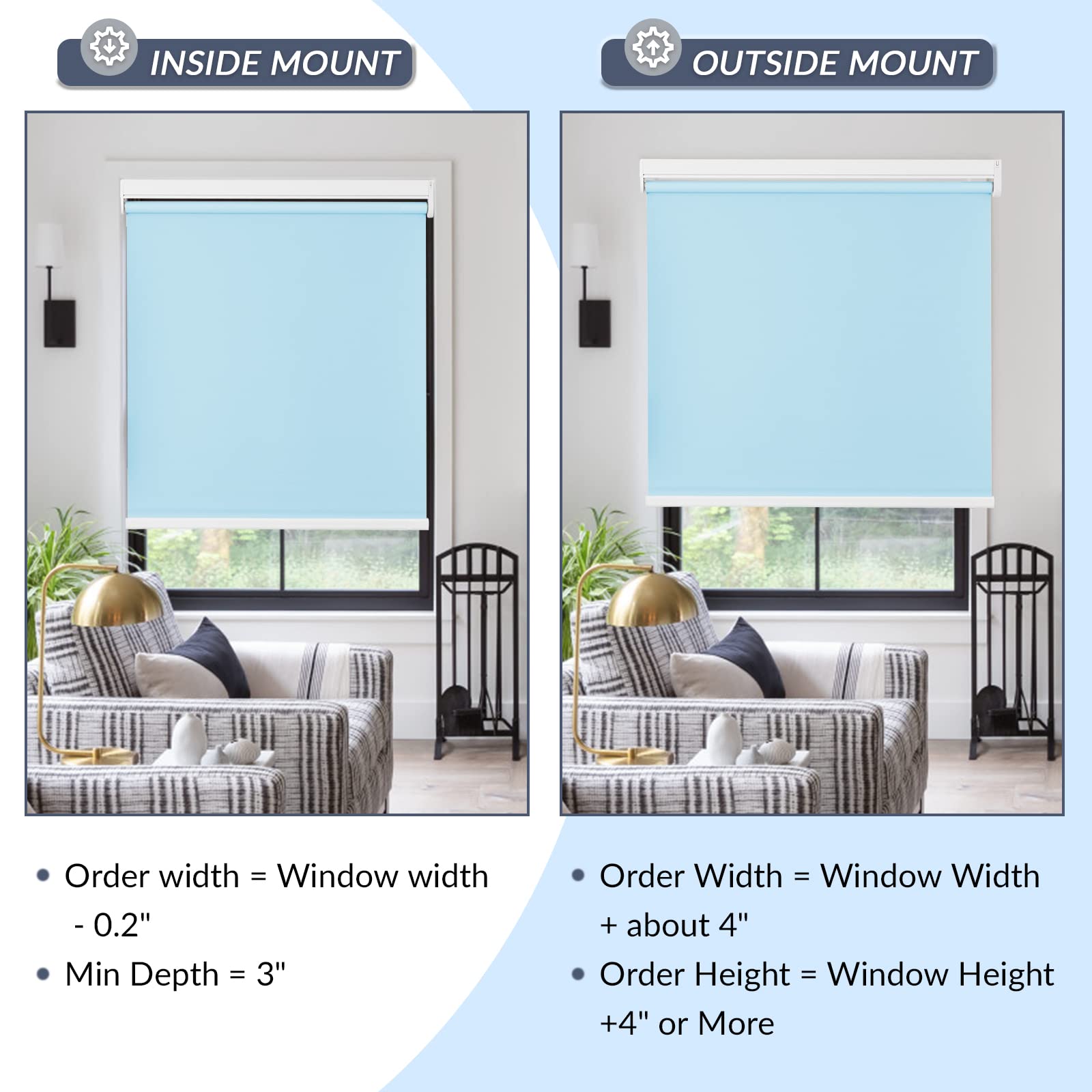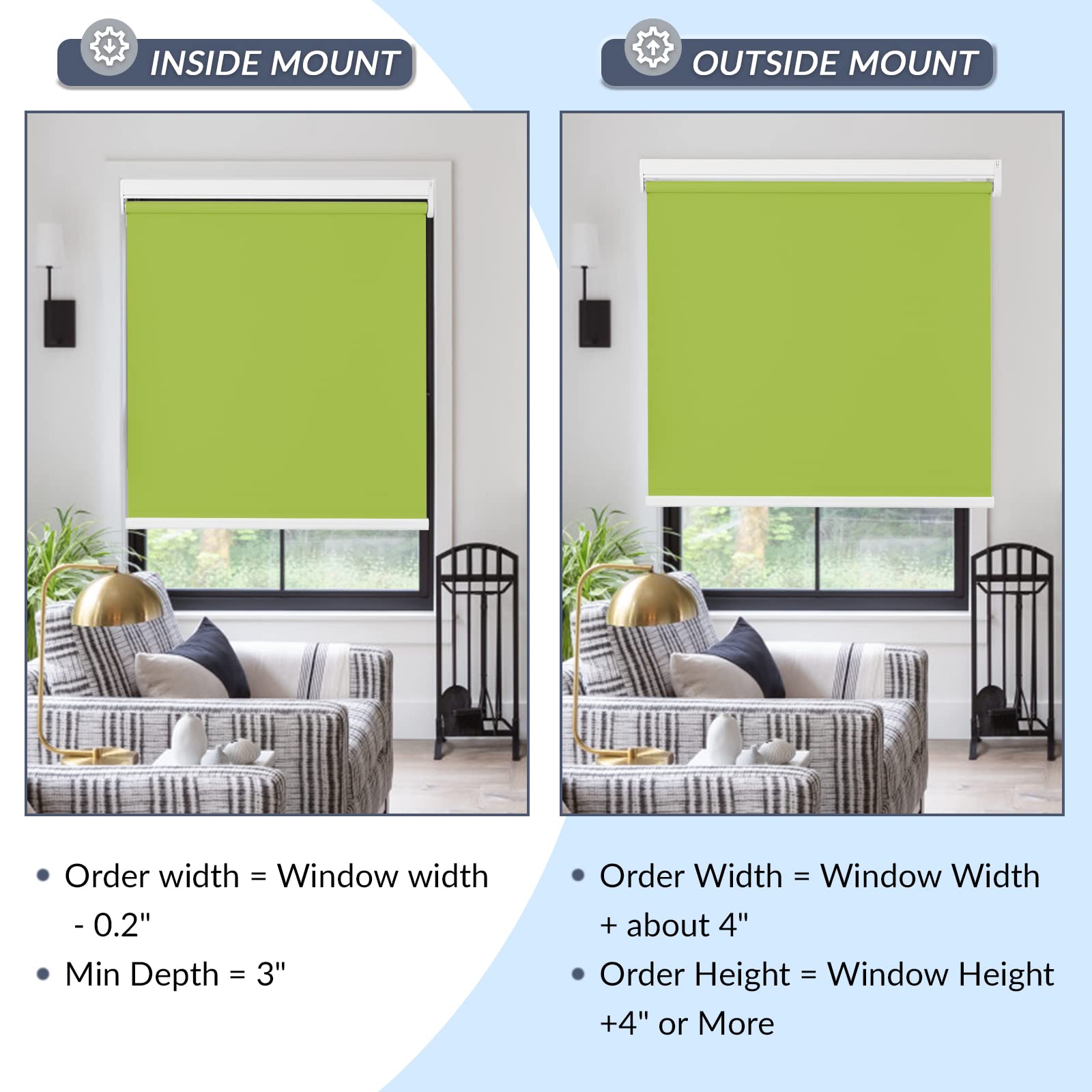 Please note: The fabric width will be slightly narrower than the headrail width (roughly a ½’’ gap on each side). The gap is required in order for the shades to operate properly. Most customers are OK with this, but if you want to block more light and have more privacy, consider an outside mount with extra width, or other products such as blackout cellular shades.