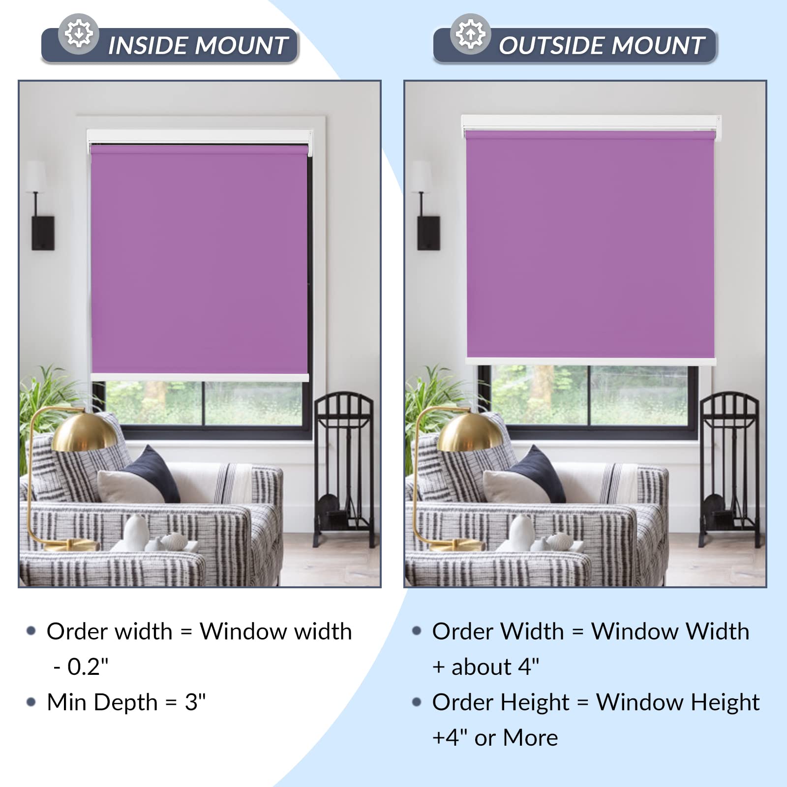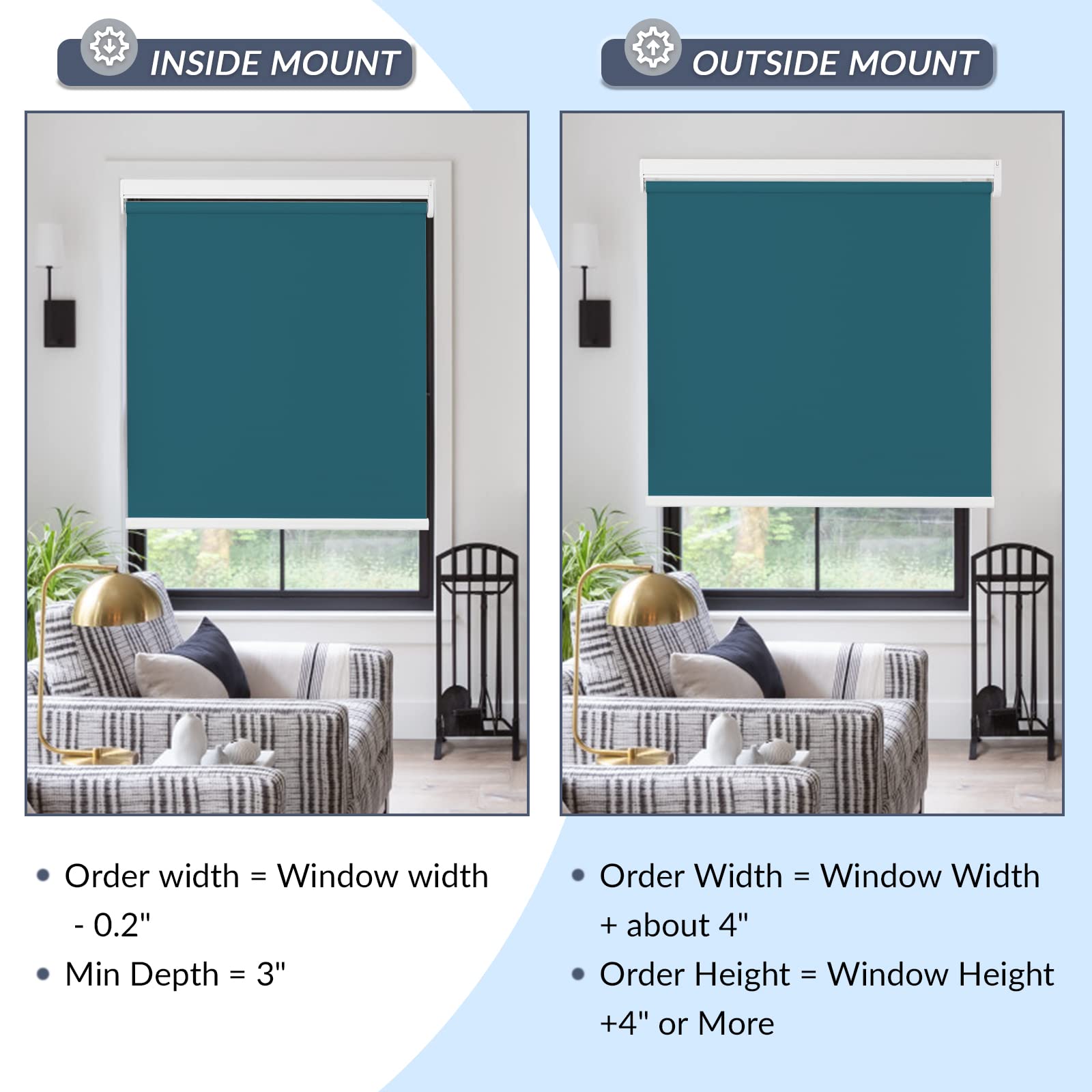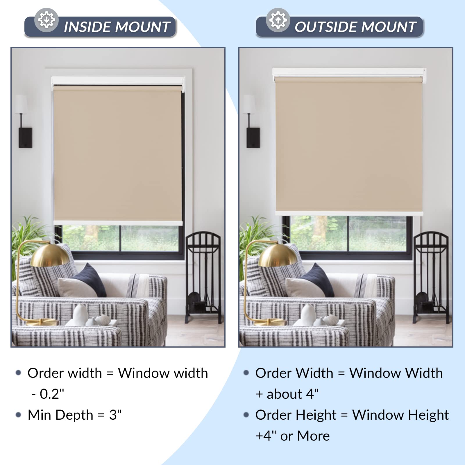 Please note: The fabric width will be slightly narrower than the headrail width (roughly a ½’’ gap on each side). The gap is required in order for the shades to operate properly. Most customers are OK with this, but if you want to block more light and have more privacy, consider an outside mount with extra width, or other products such as blackout cellular shades.