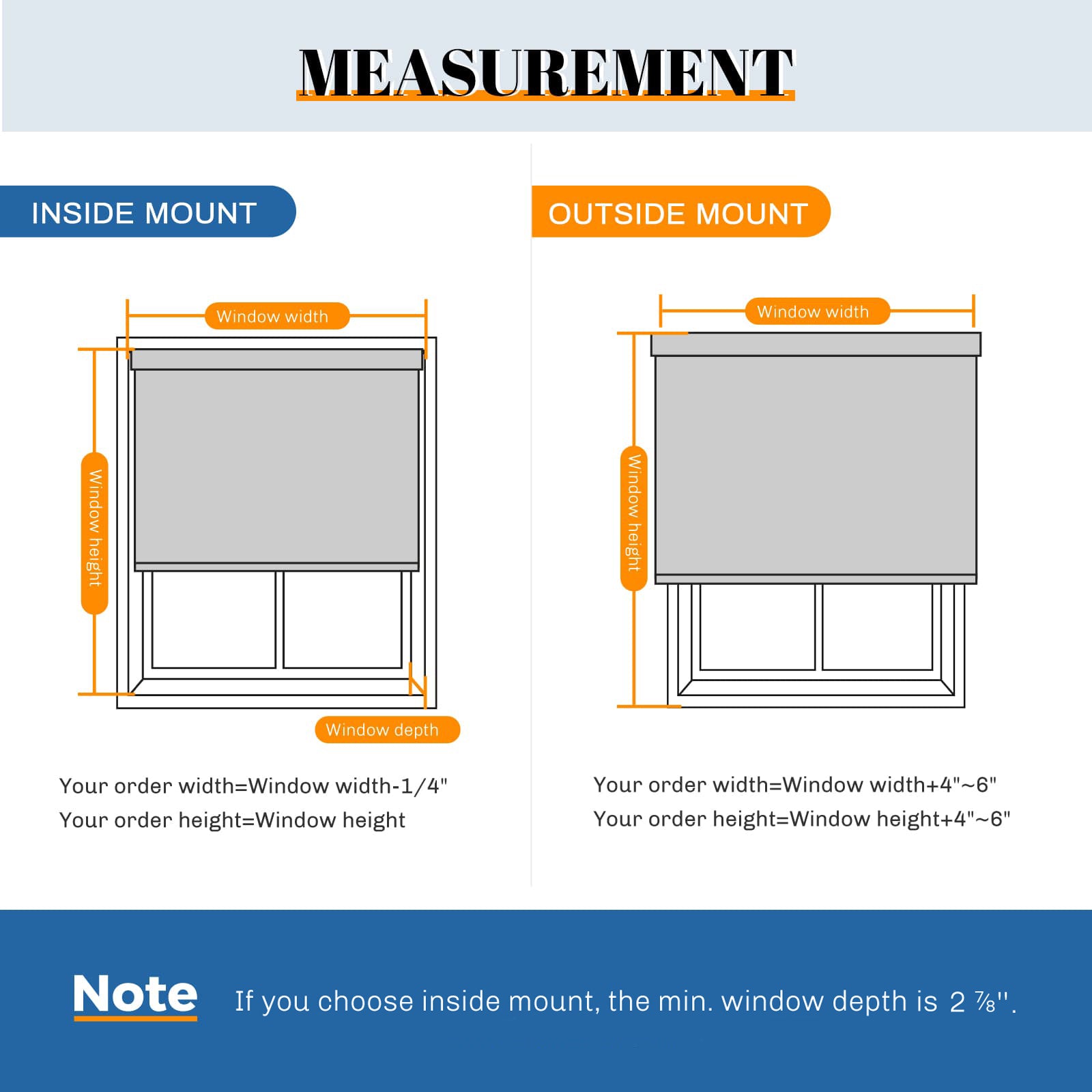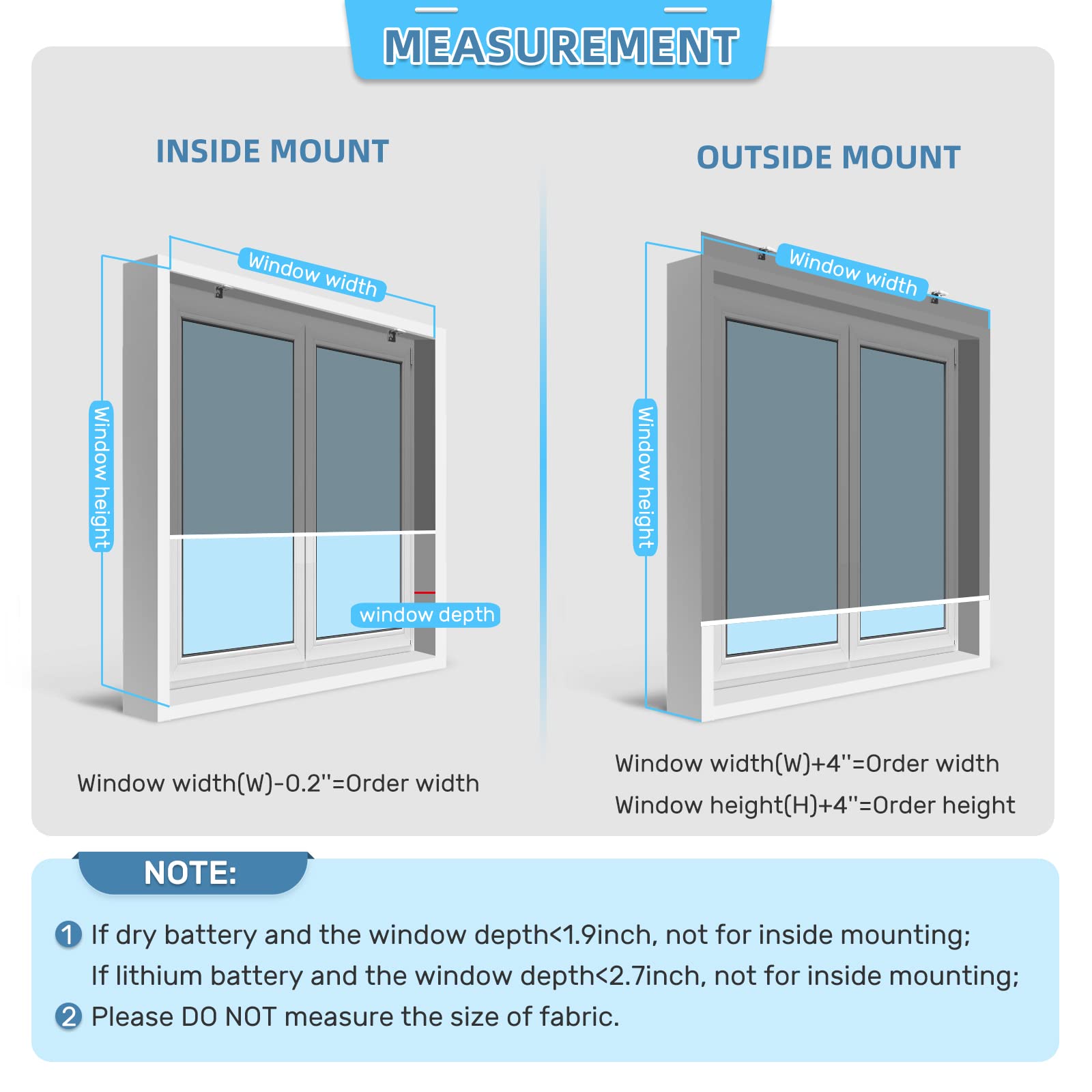- Measuring the depth: Your window needs to be deep enough for an inside mount. For dry-battery model, the minimum depth is 1 ⅞’’. For rechargeable model, the minimum depth is 2 ⅞’’.